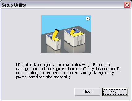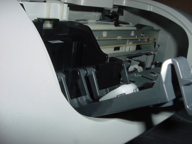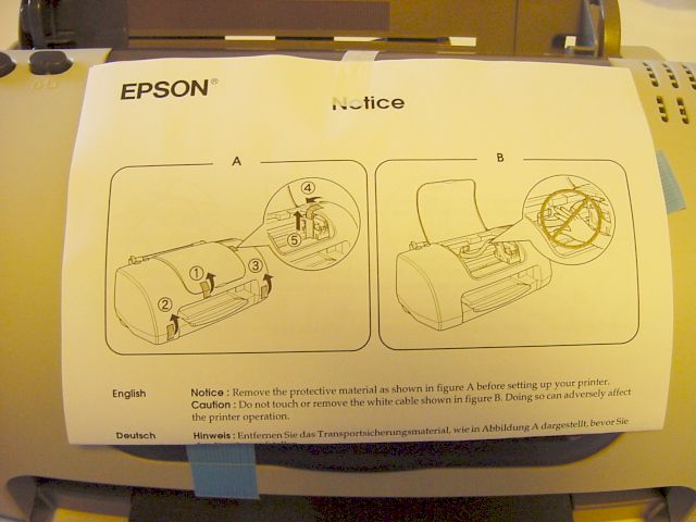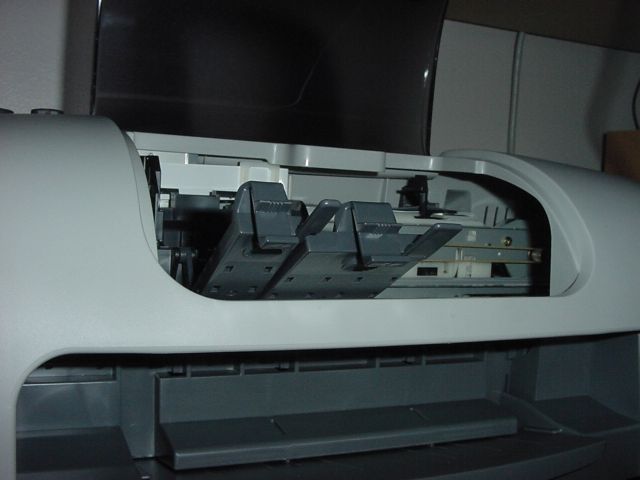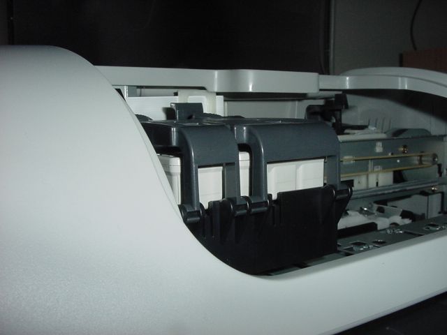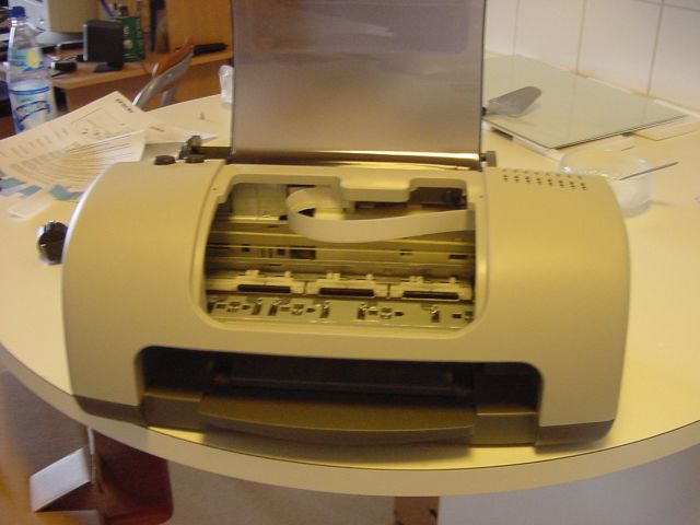 Neuvoo poistamaan teippiä myös mustekaseteista, mutta taas liian vähän neuvoja; onneksi sattumalta katsastan suuttimet ja huomaan että nekin on teipattu läpinäkyvällä teipillä! Noista olisin jo ehkä hätäynyt soittamaan tukeen jos en olisi reipas poika ja uskaltaisi kokeilla kokemuksen perusteella. Kasetinpaikat on HP:hen tottuneesta vähän kummat, mutta kyllä ne sitten ihan hyvin toimii kunhan kasetit saa ensin oikein päin paikoilleen.