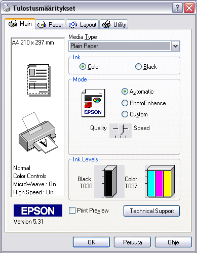 Säädöissä löytyy ihan siinä missä HP:stäkin, joskin tämäkin on vain enkku. Tarjottimen tilamittari kertoo hyödyllisiä juttuja, lähinnä mustekaseteista.