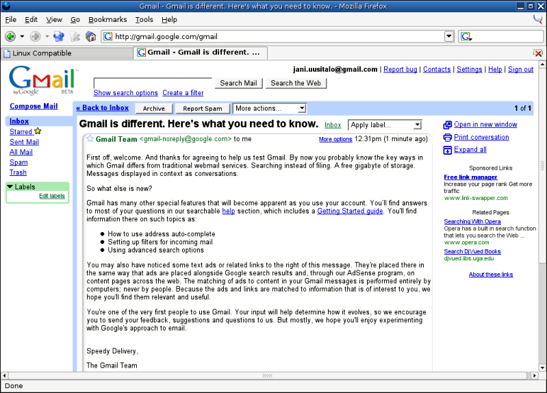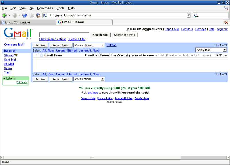 Mitäpä tuosta sitten sanoisi — no se on web-pohjainen sähköposti, en siitä oikeastaan sen ihmeempiä osaa sanoa. Kokeiluviestin laitoin ja kaikki pelasi ihan ok. Ei mitään erityistä. Väittävät että gigatavun pitäisi riittää niin että ei ikinä tartte tuhota mitään, mutta luulen että jokunen digikameraharrastaja kyllä tulee saamaan oman laatikkonsa täyteen jonain päivänä.