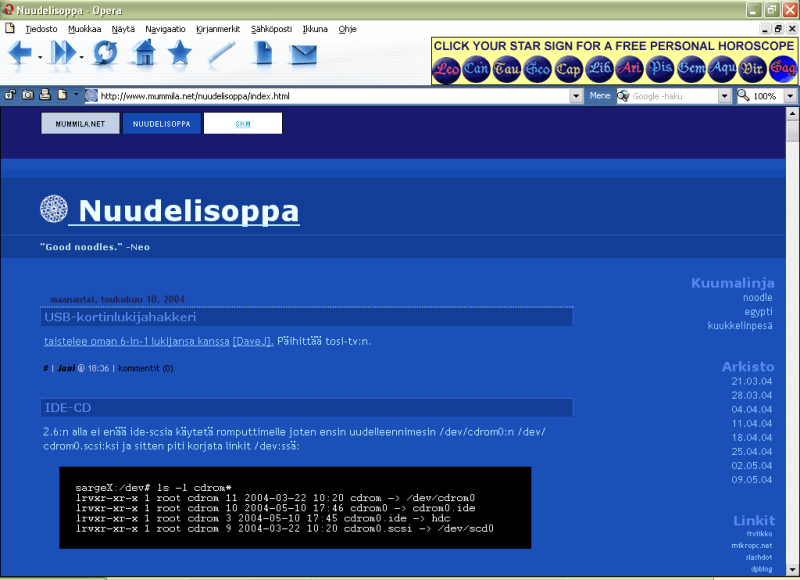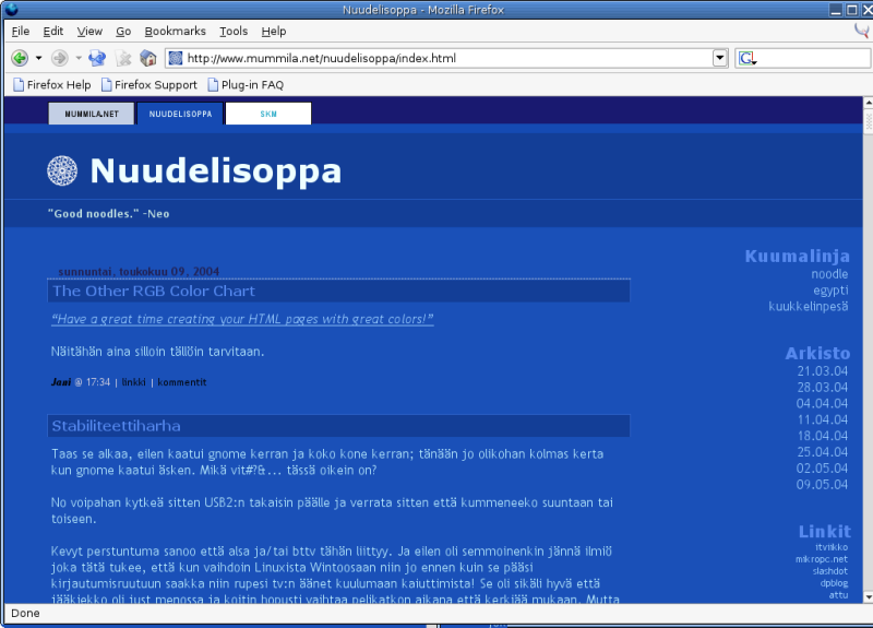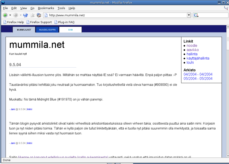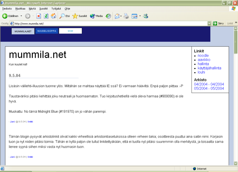 Muokattu 11.5.2004: Opera näyttää sekin toisin kuin on tarkoitus. Pitää tarkastaa koodi, koska Operan olettaisin sentään pyrkivän standardeihin ja sen takia olen valmis tulemaan vastaan puolitiehen - jos ei sitten kerta kaikkiaan vain koodini ole se joka tässä bugittaa pahiten. IE saa joka tapauksessa näyttää ihan mitä tahtoo.