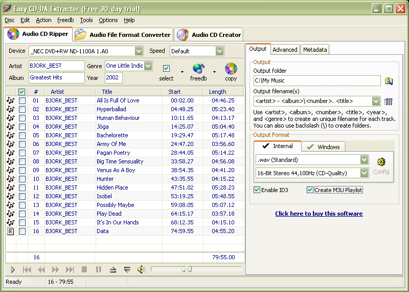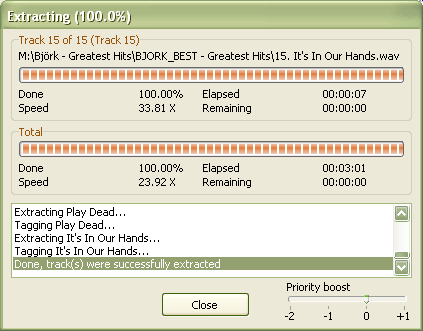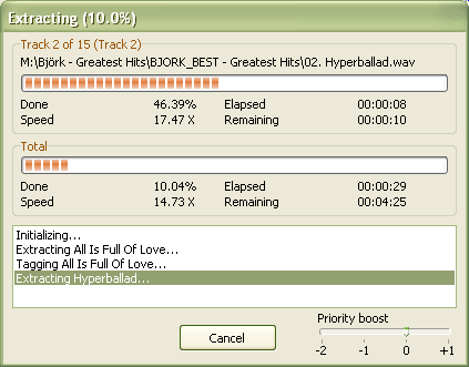 Enää jäljellä ehjän kopion polttaminen waveista. Senkin tuo osaa hoitaa, mutta tässä vaiheessa siirrän vastuun Nerolle. Björkin levy on ainut kopiointisuojattu levy joka mulla on, enkä enempää aio ostaa, mutta niille, jotka niitä vielä ostaa, suosittelen kyllä tätä ehdottomasti, varsinkin kun tämän ostamalla tukee kotimaista harrastajaa.