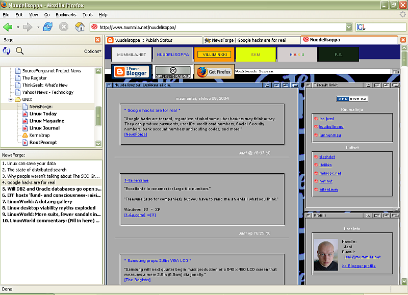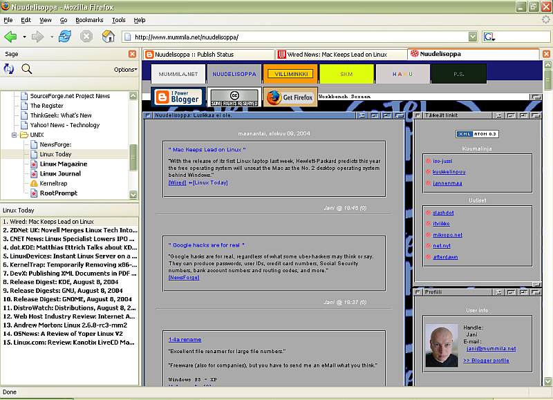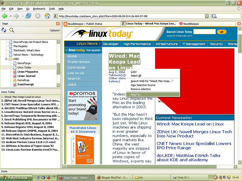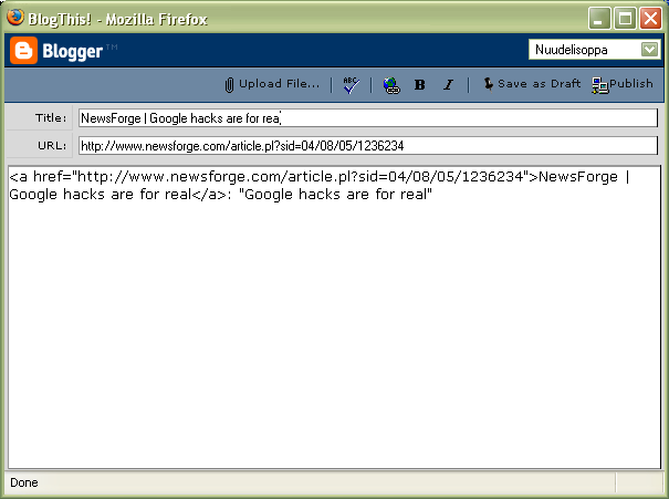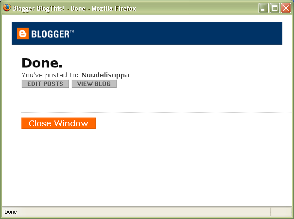 BlogThis by Phil Ringnalda (... adds) a context menu option to blog a link to the current page and the selected text (if any) through Blogger's BlogThis form.