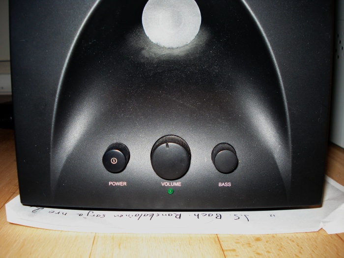 - Varmista, että kaiuttimissa on virta päällä. Virta kytketään lattianrajassa olevan subwooferin vasemmanpuolimmaisesta napista, jonka alla lukee POWER. Kun virta on kytketty, subwooferin keskimmäisen säätimen (VOLUME) alla oleva vihreä LED-valo palaa.