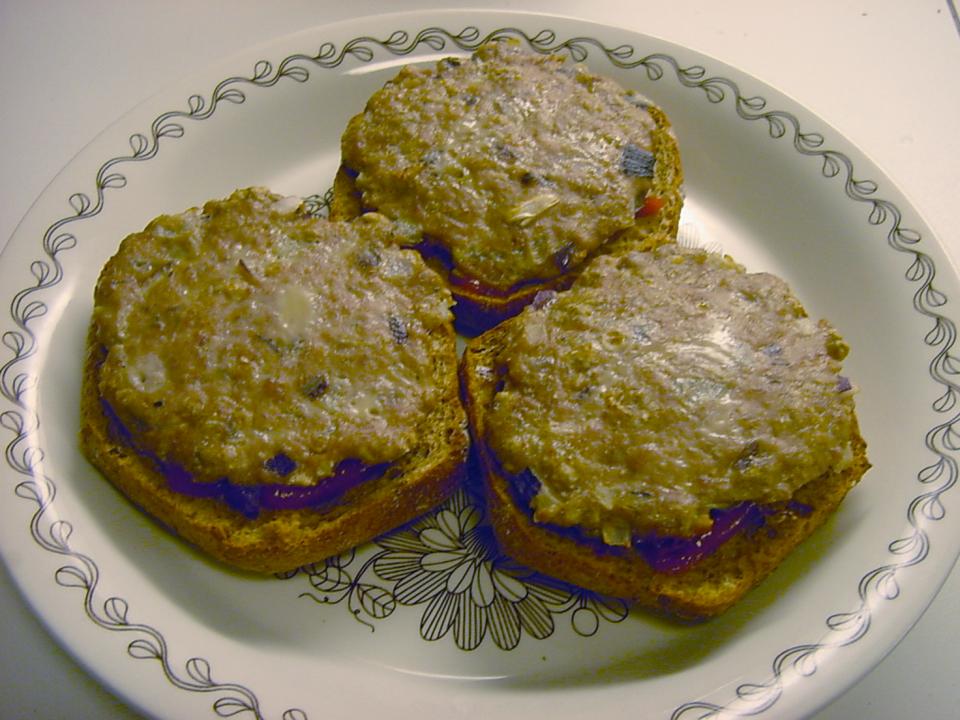 Kolme ruissämpylän pohjaa, joilla jauhelihapihvi kullakin.