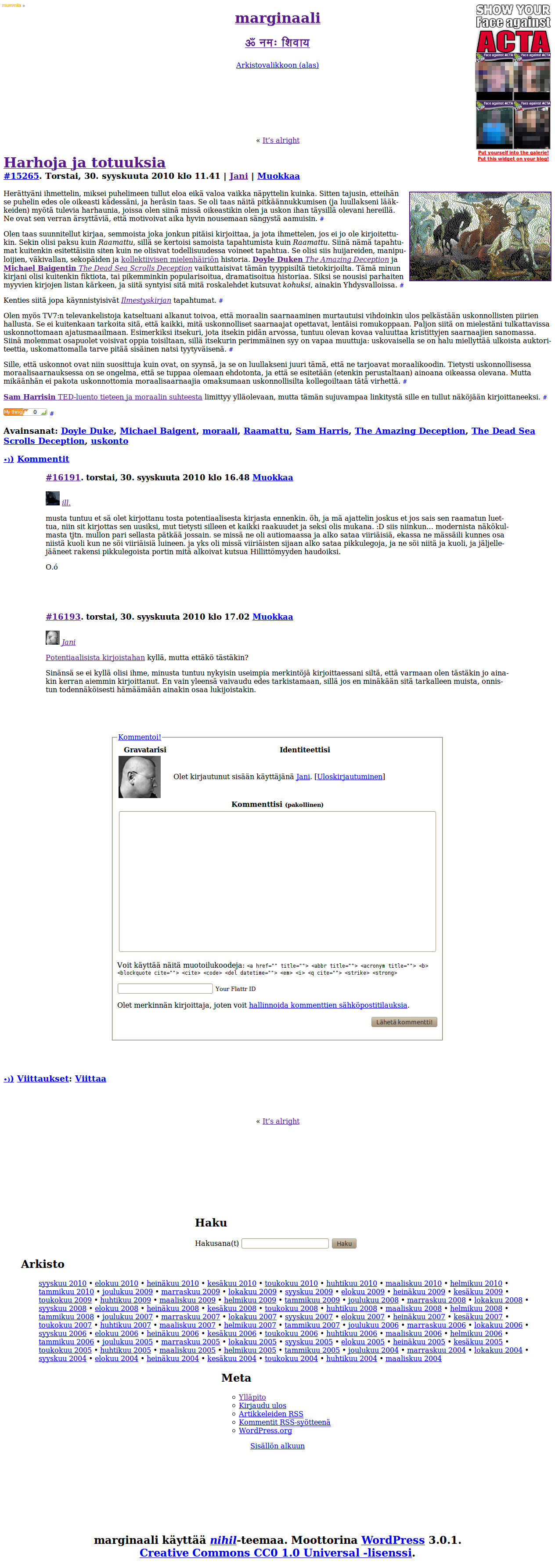 Kuvakaappaus marginaalista. Oikeassa yläkulmassa Faces Against ACTA -kampanjan banneri, josta kasvokuvat pikselöity.
