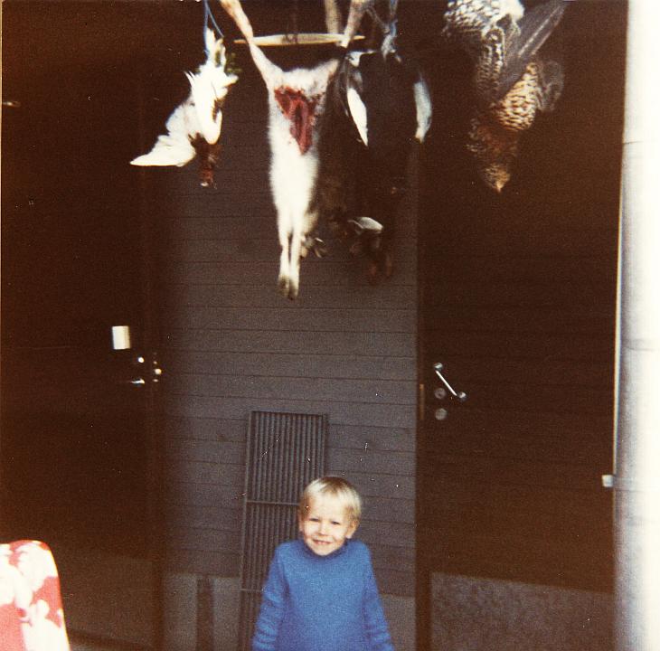 Minä pienenä poikana kolmen tapetun metsäkanan ja jäniksenraadon alla.