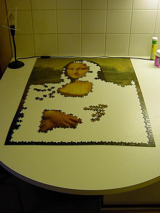 Mona Lisa -aiheinen palapeli, josta yläosa osittain ja hahmon kädet (kämmenosat) kokonaan valmiiksi koottuina.