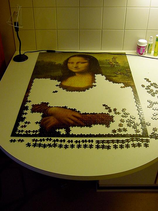 Mona Lisa -aiheinen palapeli, josta yläosa ja hahmon kädet valmiiksi koottuina.