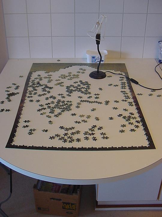 Mona Lisa -aiheisen palapelin yläosan kellertävän taustan kokoaminen lähestyy loppuaan.