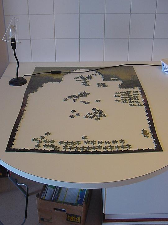 Mona Lisa -aiheisen palapelin yläosan vihreän taustan kokoaminen lähestyy loppuaan.