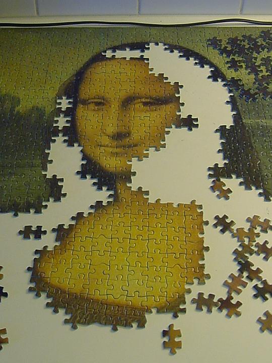 Mona Lisa -aiheinen palapeli, josta hahmon kasvot ja kaula-aukko valmiiksi koottuina.
