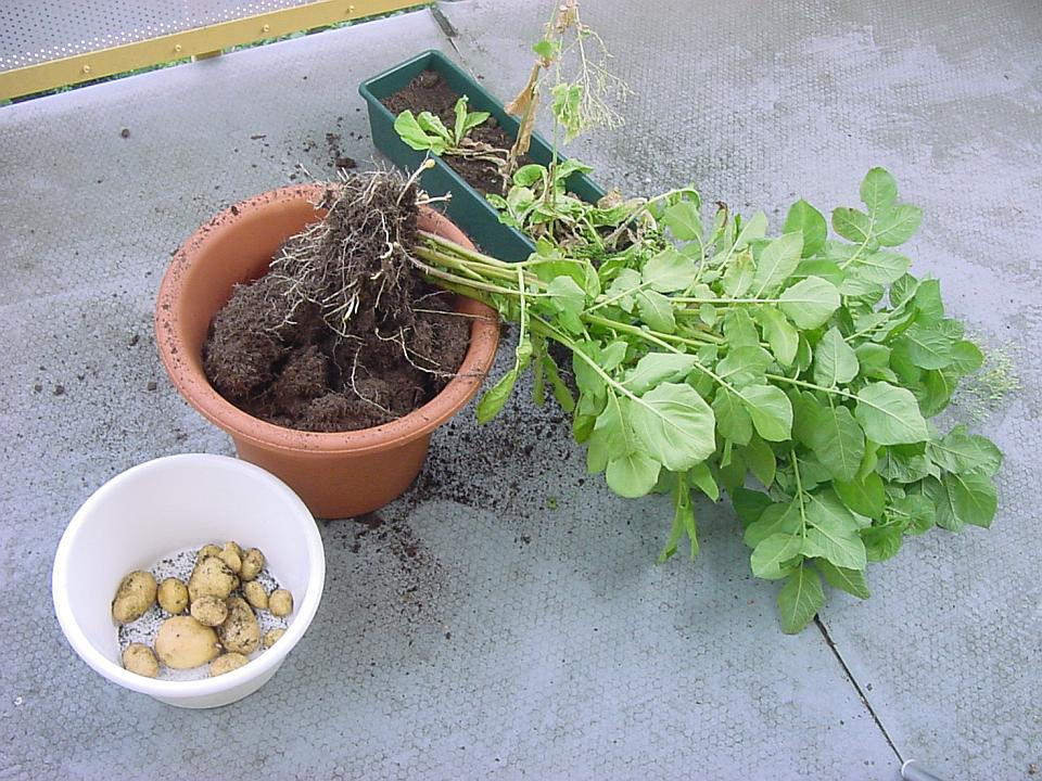 Ruskeassa ruukussa kasvattamani perunat valkoisessa ämpärissä ja niiden kaali multaruukun päällä.