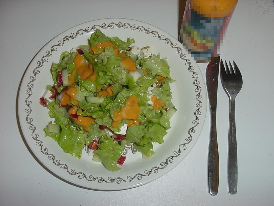 Lautasellinen kevyellä Thousand Island -kastikkeella maustettua salaattia (kurkkua, lehtisalaattia, tomaattia, sipulia, paprikaa ja fetaa).