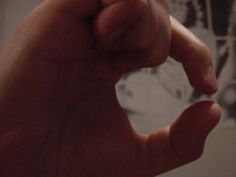 | 24. helmikuuta 2009 kello 21.51 | Näin hilkulla.jpg (tiedosto) | 36 KiB | Peukalon ja etusormen välinen pieni rako. | 1 | |